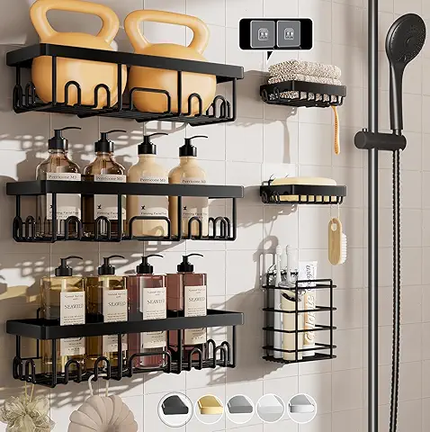 Veken Stainless Steel Shower Caddy 6-Pack, No Drilling & Rustproof, Waterproof Adhesive Shelves Rack with Soap Holder, Large Capacity Bathroom Organizers and Storage, Wall-Mounted Kitchen & Home Decor
