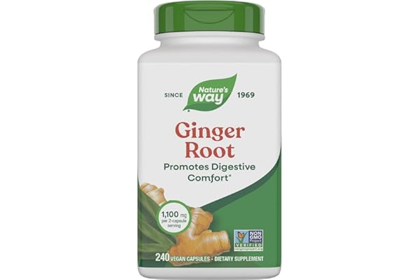 Nature’s Way Ginger Root Capsules 550 mg per capsule, Digestive Comfort* Reduces Motion-Related Nausea*, 1,100 mg per 2 Capsules, Non-GMO Project Verified, Vegan, 240 Count
