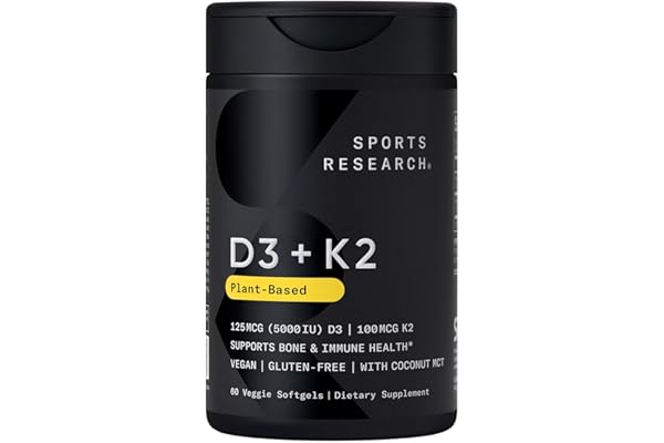 Sports Research® Vitamin D3 + K2 w/Coconut MCT Oil – Vegan D 5000iu (125mcg) & Vitamin K2 as MK7 100mcg – Vegan Certified · Non-GMO · Gluten & Soy Free – 60 Softgels